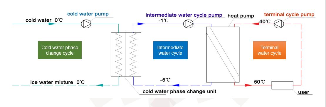 (1) Cold water phase change cycle: cold water enters the cold water phase change unit at 0℃, releases phase change energy, becomes 0℃ of ice & water mixture, and then returns through the pipeline;