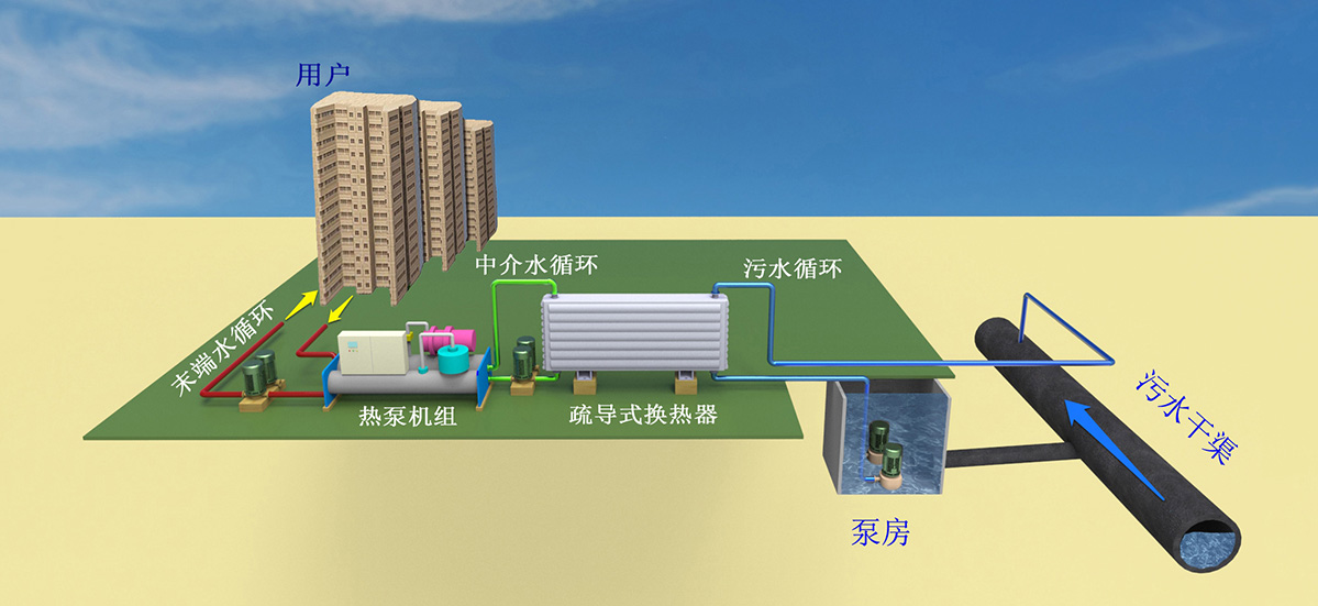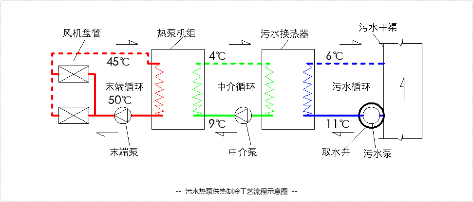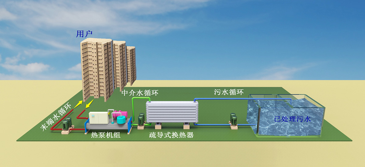 其中的技術(shù)關(guān)鍵是污水或地表水的高效換熱循環(huán),以及各子循環(huán)的有效匹配,實(shí)現(xiàn)系統(tǒng)的低能耗運(yùn)行,達(dá)到節(jié)能環(huán)保的目的。