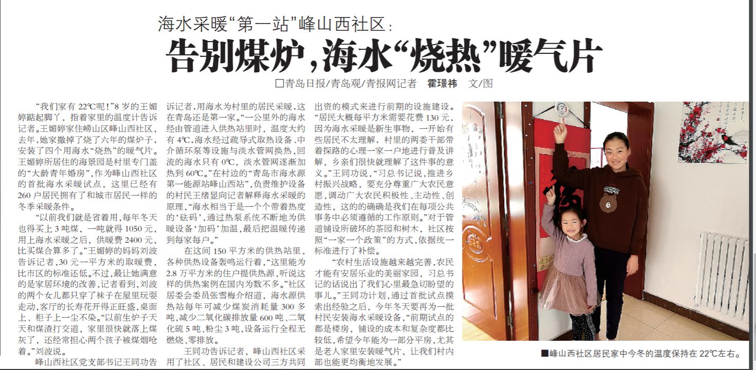 “我們家有 22℃呢!”8歲的王媚婷踮起腳丫,指著家里的溫度計(jì)告訴記者。王媚婷家住嶗山區(qū)峰山西社區(qū),去年,她家撤掉了燒了六年的煤爐子,安裝了四個(gè)用海水“燒熱”的暖氣片。王媚婷所居住的海景園是村里專門蓋的“大齡青年婚房”,作為峰山西社區(qū)的首批海水采暖試點(diǎn),這里已經(jīng)有260戶居民擁有了和城市居民一樣的冬季采暖條件。