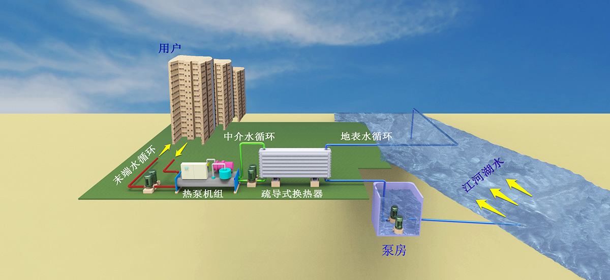 地表水源熱泵系統(tǒng)宏觀上由三個(gè)子循環(huán)系統(tǒng)組成,即地表水循環(huán)統(tǒng)、中介水循環(huán)系統(tǒng)、末端水循環(huán)系統(tǒng)。