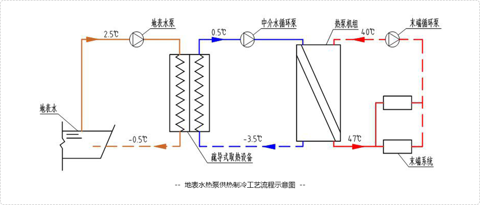 系統(tǒng)的主要設(shè)備包括地表水泵、疏導(dǎo)式換熱器、中介水循環(huán)泵、熱泵機(jī)組、末端循環(huán)泵。
