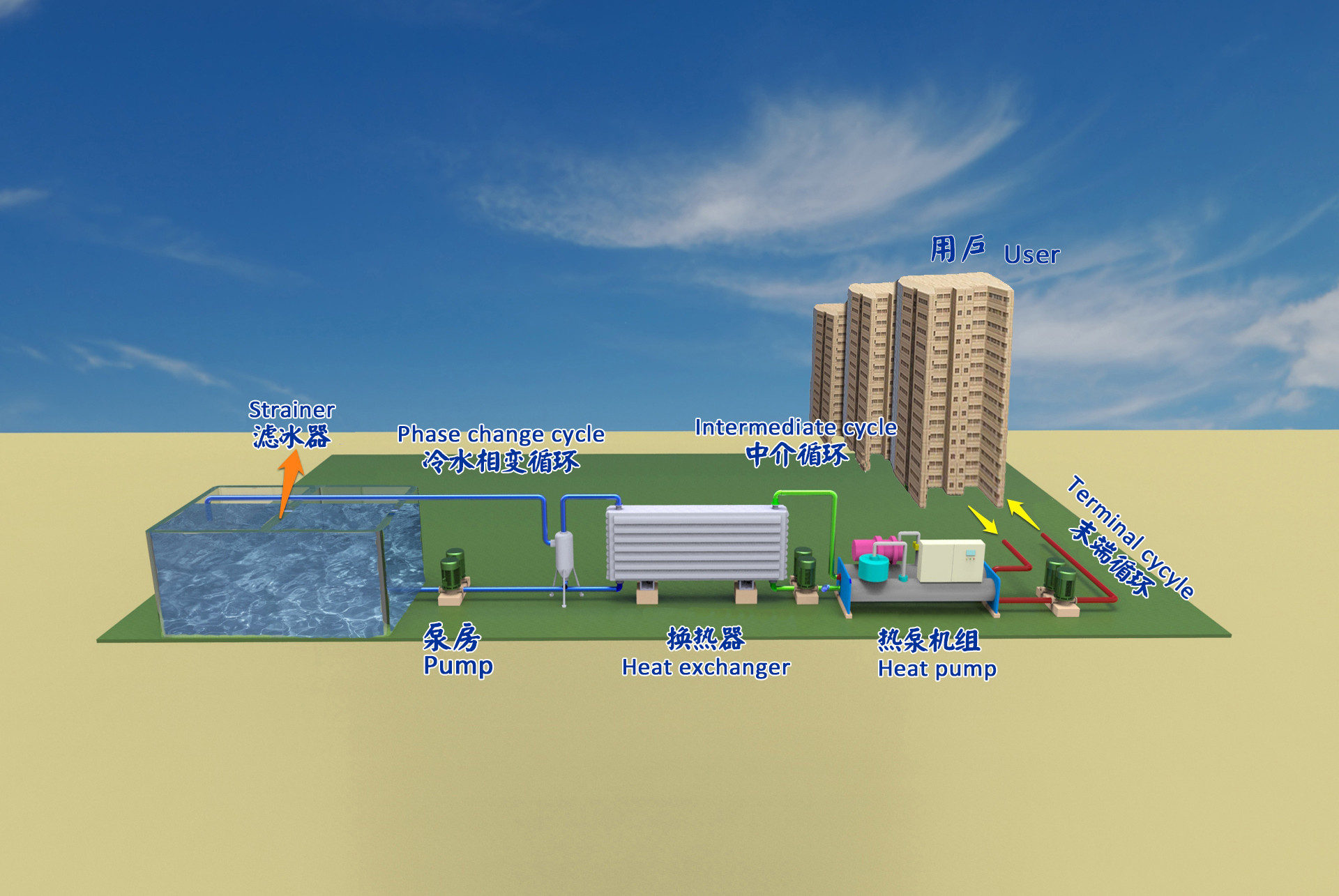 (3) Terminal water cycle: 40℃ terminal water enters the heat pump unit, absorbs heat to rise to 50 degrees, and then enter the user building through the pipeline.