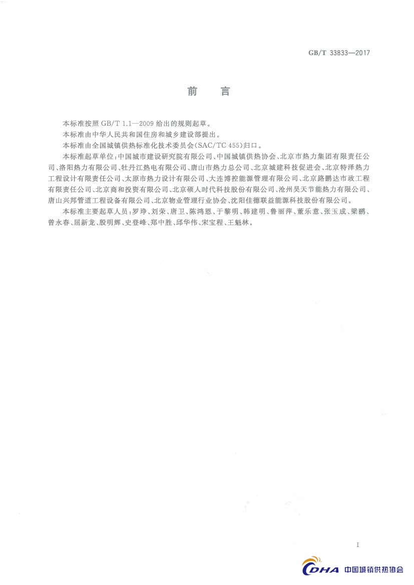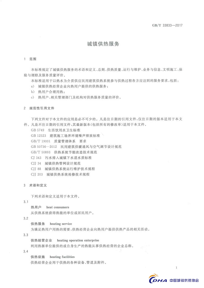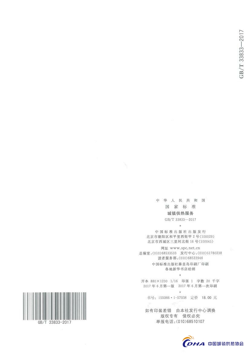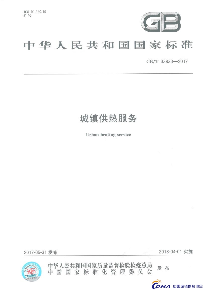 由中國城市建設研究院有限公司、中國城鎮(zhèn)供熱協(xié)會、北京市熱力集團有限責任公司為主要起草單位編寫的《GB/T 33833-2017 城鎮(zhèn)供熱服務》國家標準于2017年5月31日由中華人民共和國國家質(zhì)量監(jiān)督檢驗檢疫總局和中國國家標準化管理委員會聯(lián)合發(fā)布發(fā)布,于2018年4月1日起實施。
