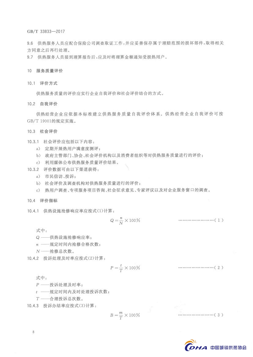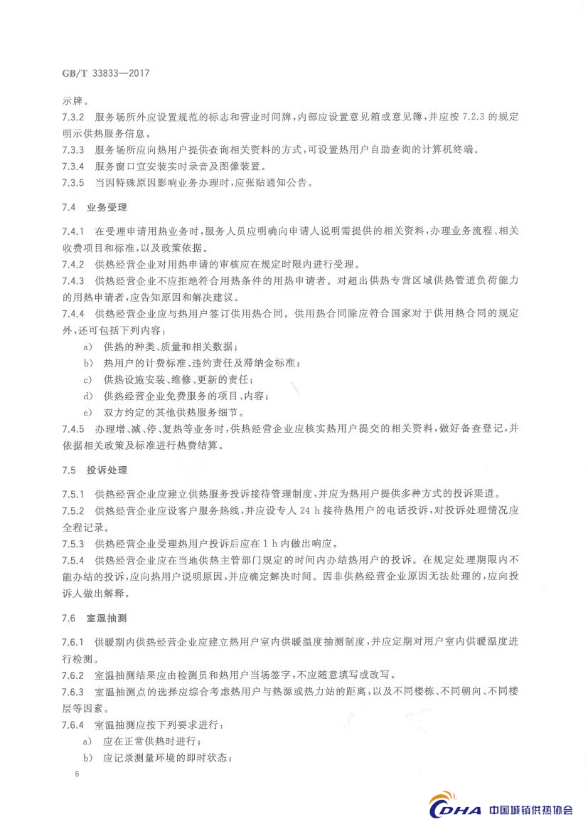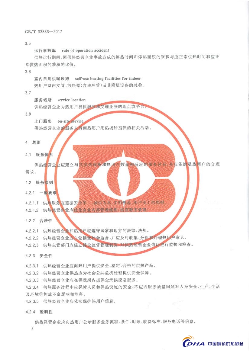 《城鎮(zhèn)供熱服務》標準共分為九章,第一章為標準的范圍,第二章規(guī)范性引用文件,第三章是本標準所涉及的術語和定義,第四章為總則,第五章供熱質(zhì)量,第六章運行與維護,第七章業(yè)務及信息服務,第八章供熱保障,第九章服務質(zhì)量評價。